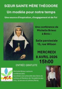 Invitée par le MCR, Michelle Brieuc donnera une conférence sur Mère Théodore le mercredi 8 avril à 15h00 aux salle paroissiale de Binic 15 rue Wilson.