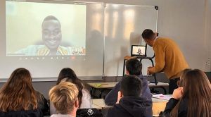 Qu’à cela ne tienne, grâce à l’implication de Yann et Nicolas nos deux enseignants parties prenantes dans le projet, une visio-conférence Pommerit – Haïti a pu se mettre en place avec les jeunes de la classe de seconde CGEA et ITECA représenté sur l’écran par les visages de Alberte et Daniel Jean.
